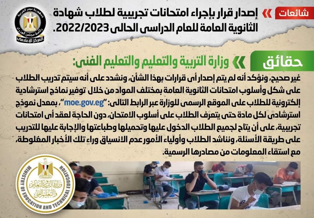 وأكدت الوزارة، أنه لا صحة لإجراء امتحانات تجريبية لطلاب شهادة الثانوية العامة للعام الدراسي الحالي 2022/2023، وأنه لم يتم إصدار أي قرارات بهذا الشأن، مُشددةً على أنه سيتم تدريب الطلاب على شكل وأسلوب امتحانات الثانوية العامة بمختلف المواد من خلال توفير نماذج استرشادية إلكترونية للطلاب على الموقع الرسمي للوزارة عبر الرابط التالي: "moe.gov.eg"، بمعدل نموذج استرشادي لكل مادة حتى يتعرف الطلاب على أسلوب الامتحان، دون الحاجة لعقد أي امتحانات تجريبية، على أن يتاح لجميع الطلاب الدخول عليها وتحميلها وطباعتها والإجابة عليها للتدريب على طريقة الأسئلة، مُناشدةً الطلاب وأولياء الأمور عدم الانسياق وراء تلك الأخبار المغلوطة، مع استقاء المعلومات من مصادرها الرسمية.