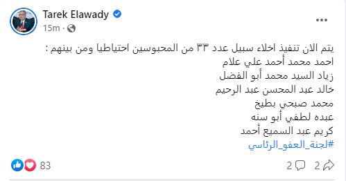 وقال المحامي طارق العوضي، عضو لجنة العفو الرئاسي، على حسابه عبر موقع التواصل الاجتماعي “فيسبوك”: "يتم الآن تنفيذ إخلاء سبيل عدد ٣٣ من المحبوسين احتياطيا ومن بينهم، أحمد محمد أحمد علي علام، وزياد السيد محمد أبوالفضل، وخالد عبدالمحسن عبدالرحيم، ومحمد صبحي بطيخ، وعبده لطفي أبوسنه وكريم عبدالسميع أحمد".