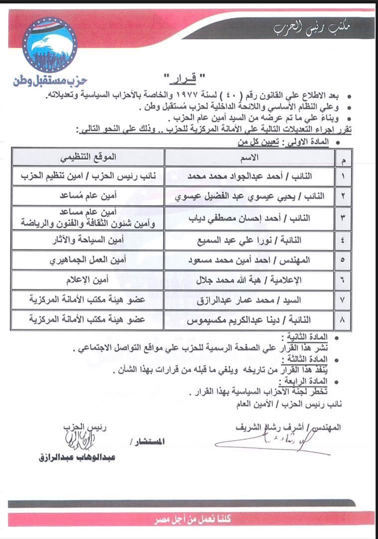 ونص القرار على تعيين النائب أحمد عبدالجواد، نائبًا لرئيس الحزب، أمينًا للتنظيم، والنائب يحيى عيسوي، أمينًا عامًا مساعدًا، والنائب أحمد دياب، أمينا عامًا مساعدًا، أمينًا لشؤون الثقافة والفنون والرياضة، والنائبة نورا علي، أمينًا للسياحة والآثار، والمهندس أحمد أمين مسعود، أمينا للعمل الجماهيري، والإعلامية هبة الله محمد جلال، أمينًا للإعلام، ومحمد عمار عبدالرازق، عضوًا لهيئة مكتب الأمانة المركزية، والنائبة دينا عبدالكريم، عضوًا لهيئة مكتب الأمانة المركزية.