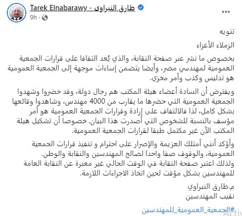 وقال النبراوي: “بخصوص ما نشر عبر صفحة النقابة، والذي يُعد التفافا على قرارات الجمعية العمومية لمهندسي مصر، وأيضا يتضمن إساءات موجهة إلى الجمعية العمومية هو تدليس وكذب وأمر مخزي”.