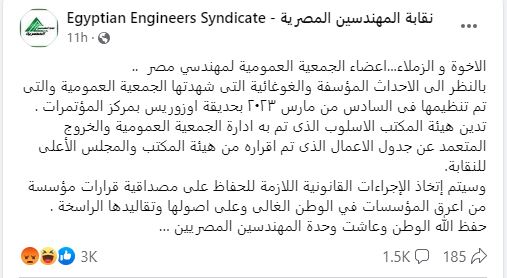 فيما استنكر عدد من المهندسين بيان هيئة المكتب المنشور عبر الصفحة الرسمية للنقابة بشأن الجمعية العمومية وقراراتها، واصفين إياه بـ"المشين" وغير المقبول.