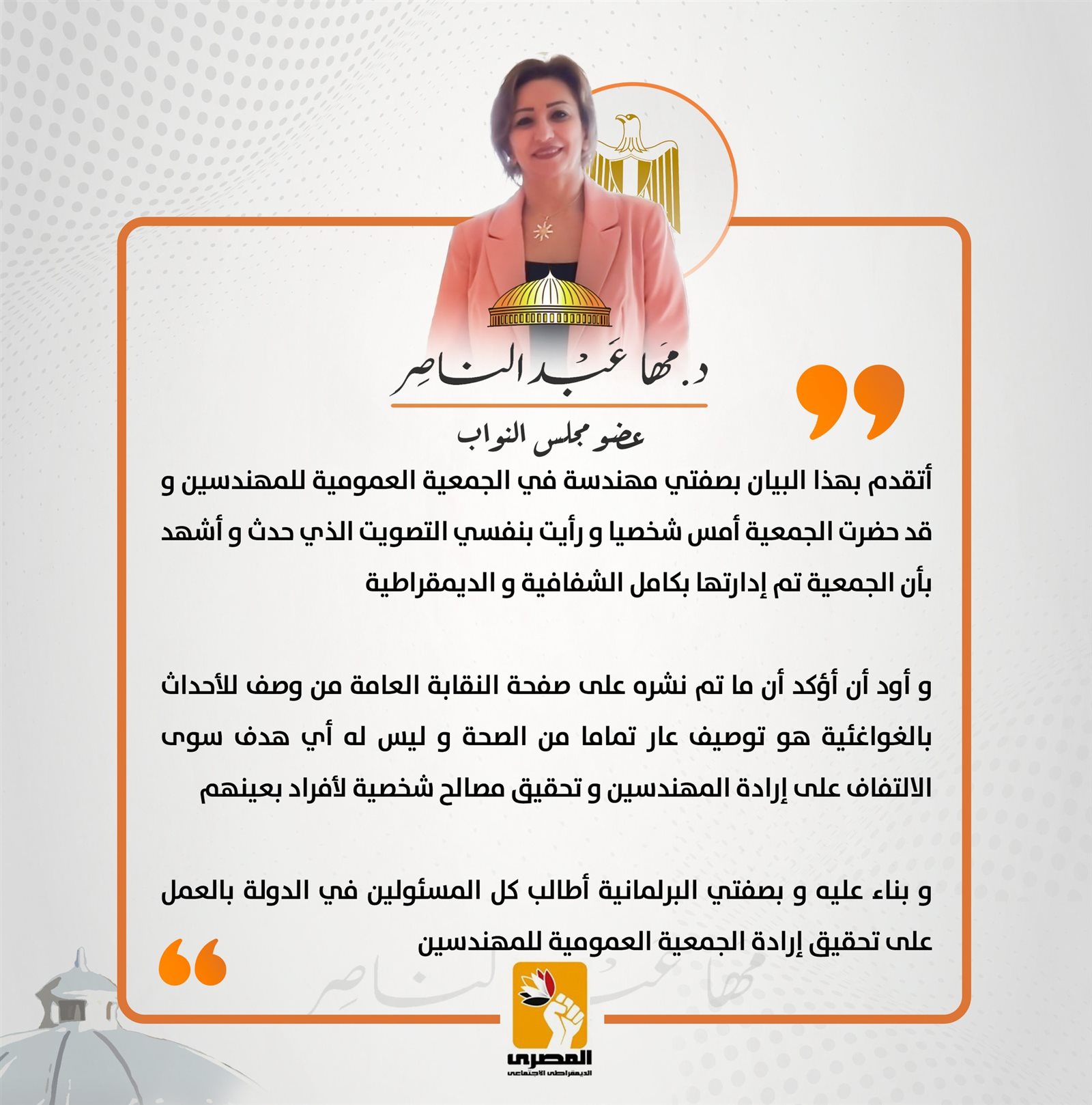 وأضافت عبد الناصر، في بيانها: «أؤكد أن ما تم نشره على صفحة النقابة العامة من وصف للأحداث بالغوغائية هو توصيف عار تماما من الصحة وليس له أي هدف سوى الالتفاف على إرادة المهندسين وتحقيق مصالح شخصية لأفراد بعينهم».