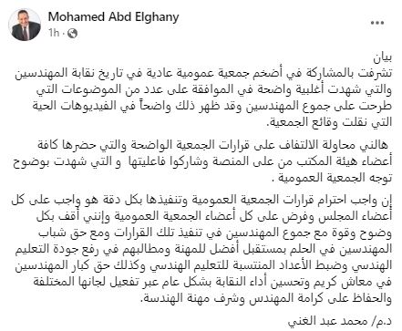 واختتم بيانه قائلا: “أؤكد أنني أمتلك العزيمة والإصرار على احترام وتنفيذ قرارات الجمعية العمومية، والوقوف صفا واحدا لصالح المهندسين والنقابة والوطن، ولذلك اعتبر صفحة النقابة في الوقت الحالي غير معبرة عن النقابة العامة للمهندسين بشكل مؤقت لحين اتخاذ الاجراءات اللازمة”.