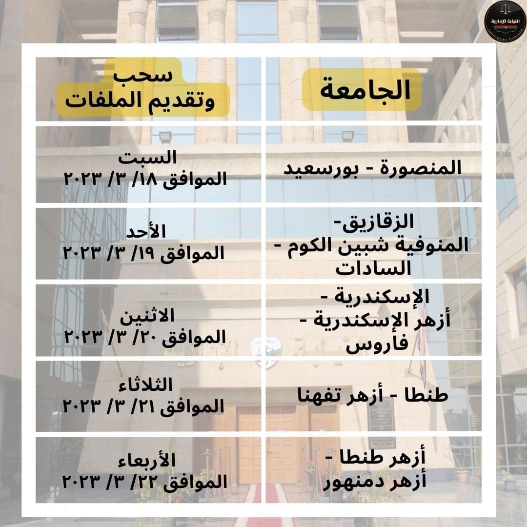 يأتي ذلك بمقر رئاسة النيابة الإدارية بميدان النجدة بمدينة ٦ أكتوبر، من التاسعة صباحا وحتى الثانية والنصف عصرًا، ووفق الأيام المحددة لكل جامعة بناءً على الجدول المعلن مسبقًا والصادر عن الأمانة العامة للمجلس الأعلى للنيابة الإدارية، وإليكم الجدول: