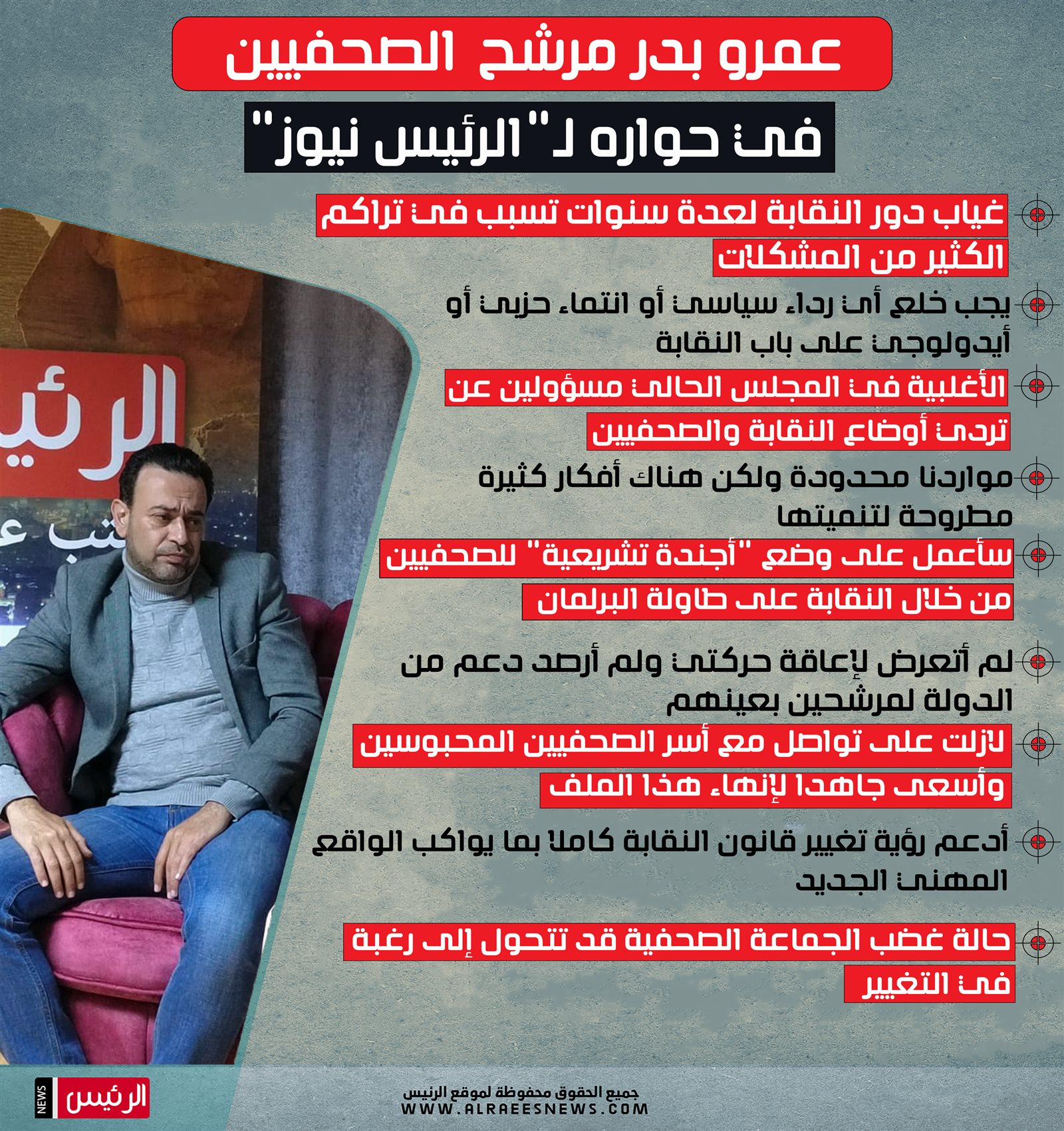 تجرى انتخابات نقابة الصحفيين على مقعد النقيب و6 أعضاء الجمعة المقبل 17 مارس داخل نقابة الصحفيين، ويخوض المنافسة ما يزيد عن 50 مرشحا، يعد من بينهم الصحفي الزميل عمرو بدر، المرشح على عضوية مجلس نقابة الصحفيين (تحت السن رقم 20)، وهو ما دعانا بموقع "الرئيس نيوز" لإجراء حوار معه، حول برنامجه الانتخابي وأسباب ترشحه، والحديث عن تجربته السابقة في المجلس خلال 4 سنوات قضاها عضوا به في الفترة ما بين عام 2017 وحتى 2021.