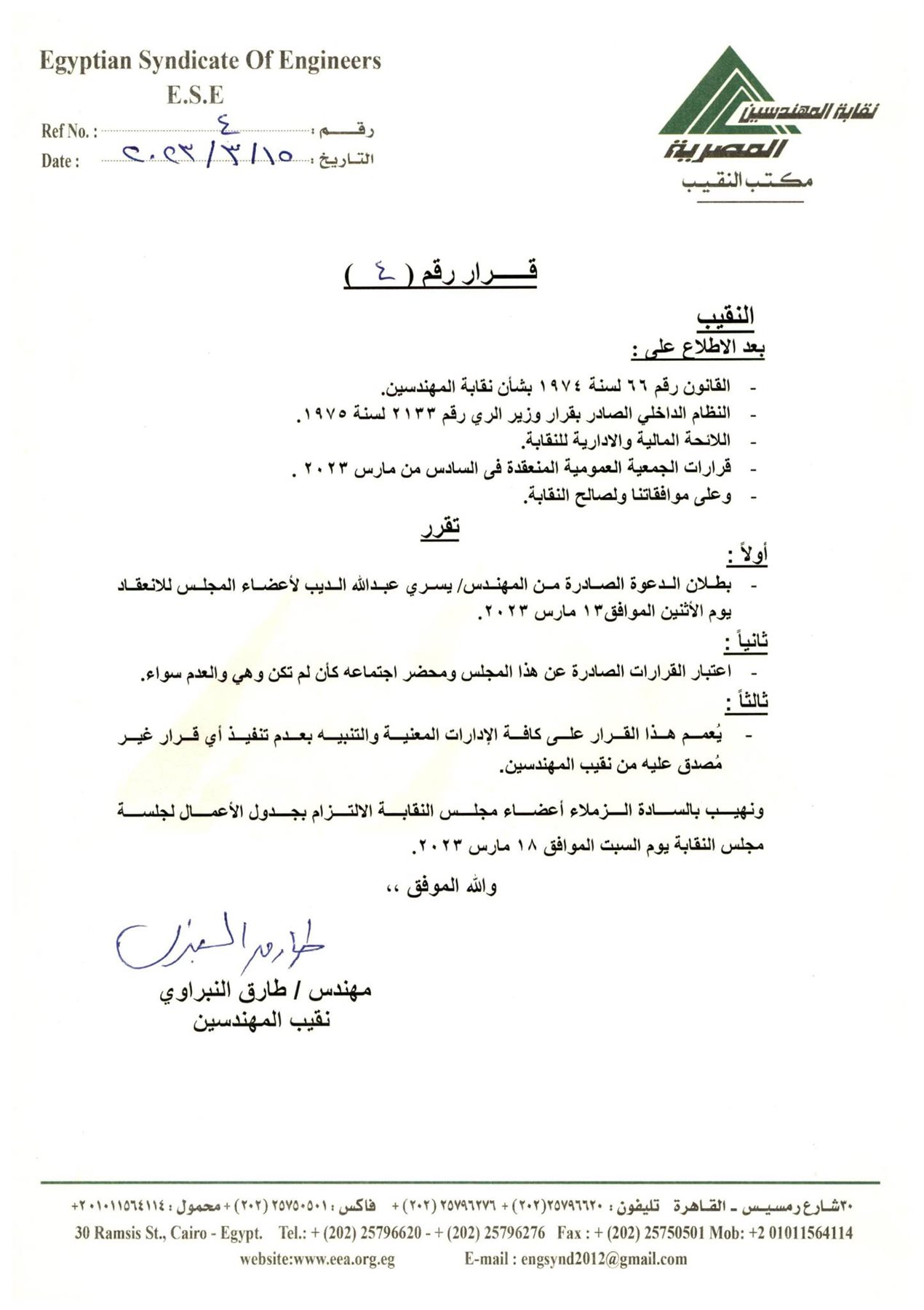 أصدر المهندس طارق النبراوي، نقيب المهندسين، قرارا اليوم الأربعاء، ببطلان الدعوة الصادرة من المهندس يسري الديب لأعضاء المجلس للانعقاد يوم 13 مارس 2023، بعد الاطلاع على قانون 66 لسنة 1974والنظام الداخلي، وعلى قرارات الجمعية العمومية المنعقدة في 6 مارس 2023، وللصالح العام.