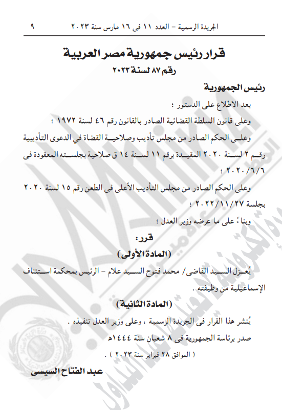أصدر الرئيس عبد الفتاح السيسي، قرار رقم 87 لسنة 2023 بعزل القاضي "محمد فتوح السيد علام" الرئيس بمحكمة استئناف الإسماعيلية من وظيفته.