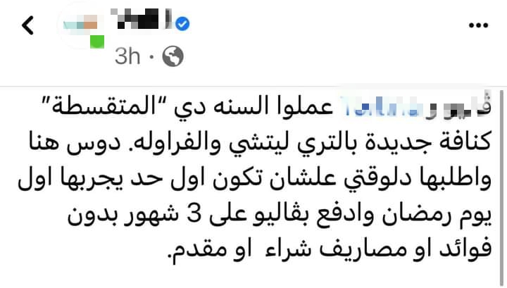 وكتب المحل نصا في منشوره على حسابه الرسمي بتطبيق فيسبوك: "عملنا السنة دي "المتقسطة" كنافة جديدة بالتري ليتشي والفراوله، دوس هنا واطلبها دلوقتي عشان تكون أول حد يجربها أول يوم رمضان، وادفع على 3 أشهر دون فوائد أو مصاريف شراء أو مقدم".