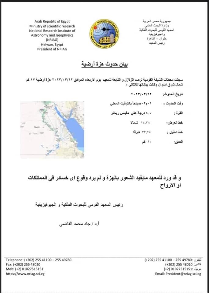 أعلن المعهد القومي للبحوث الفلكية والجيوفيزيقية عن حدوث هزة أرضية بقوة 4 درجات ريختر على بعد 17 كم شمال شرق أسوان.