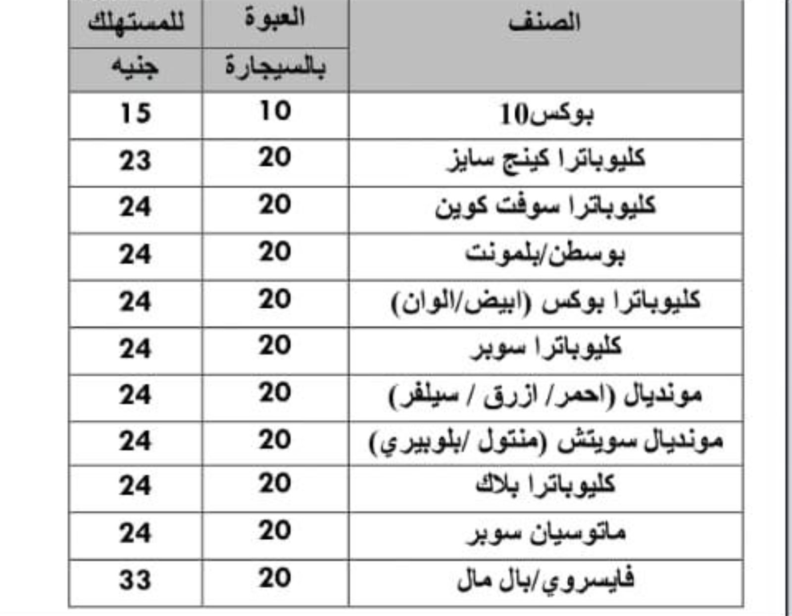 - بوكس 10: العبوة، بالسيجارة 10- سعر البيع للمستهلك 15 جنيها