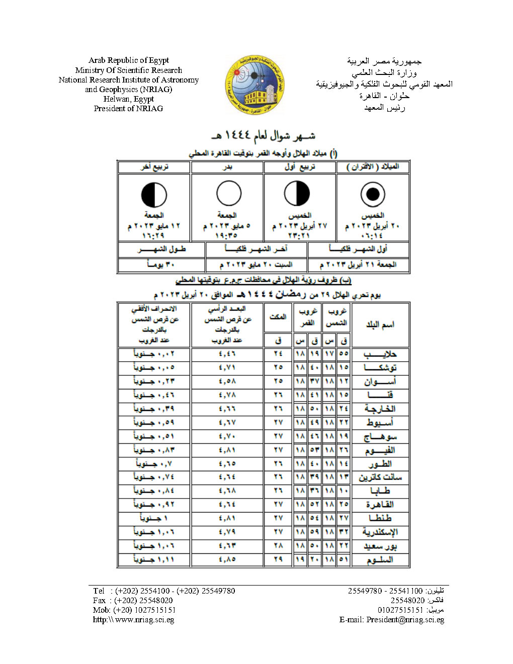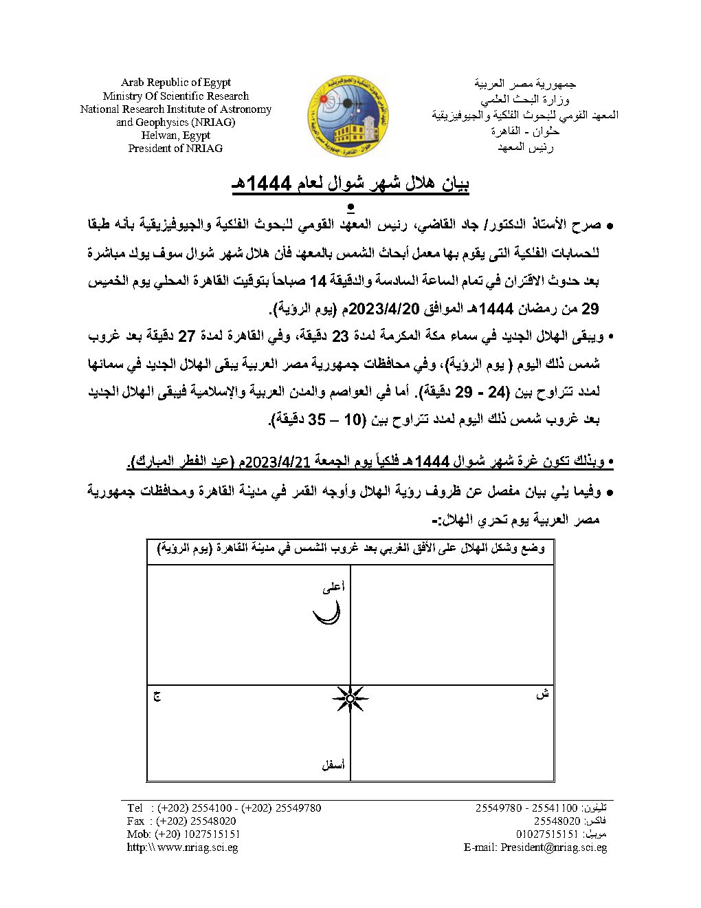 وأشار إلى أن الهلال الجديد يبقى في سماء مكة المكرمة لمدة 23 دقيقة، وفي القاهرة لمدة 27 دقيقة بعد غروب شمس ذلك اليوم ( يوم الرؤية)، وفي محافظات جمهورية مصر العربية يبقى الهلال الجديد في سمائها لمدد تتراوح بين (24 - 29 دقيقة). أما في العواصم والمدن العربية والإسلامية فيبقى الهلال الجديد بعد غروب شمس ذلك اليوم لمدد تتراوح بين (10 – 35 دقيقة)، وبذلك تكون غرة شهر شـوال 1444هـ فلكيًا يوم الجمعة 21/4/2023م (عيد الفطر المبارك).