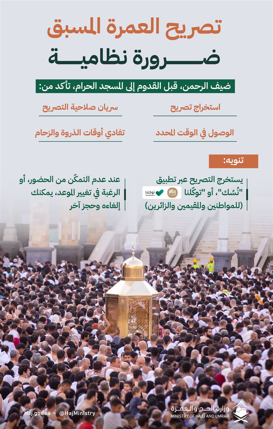 ودعت الوزارة المعتمرين، إلى أهمية الالتزام بالمواعيد والحضور في الموعد المحدد بالتصريح، مؤكدة على اشتراط وجود تصريح بالعمرة، وعلى أهمية الالتزام بالمواعيد في التصاريح لضمان تأدية العمرة.