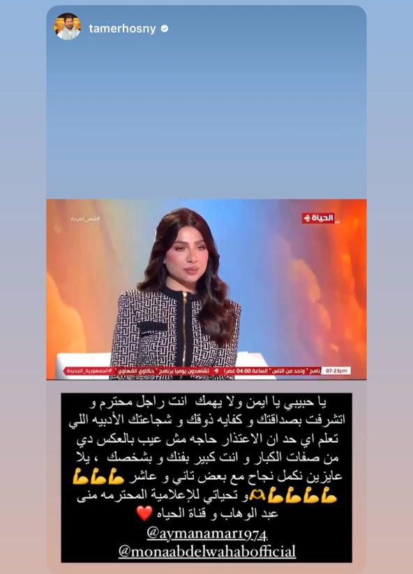 كما وجه التحية للإعلامية "مني عبد الوهاب" وبرنامج " أنا والقناع" قائلا: "تحياتي للإعلامية المحترمة منى عبد الوهاب وقناة الحياة"، وذلك بصورة من لقاء أيمن بهجت قمر من ستوديو أنا والقناع.