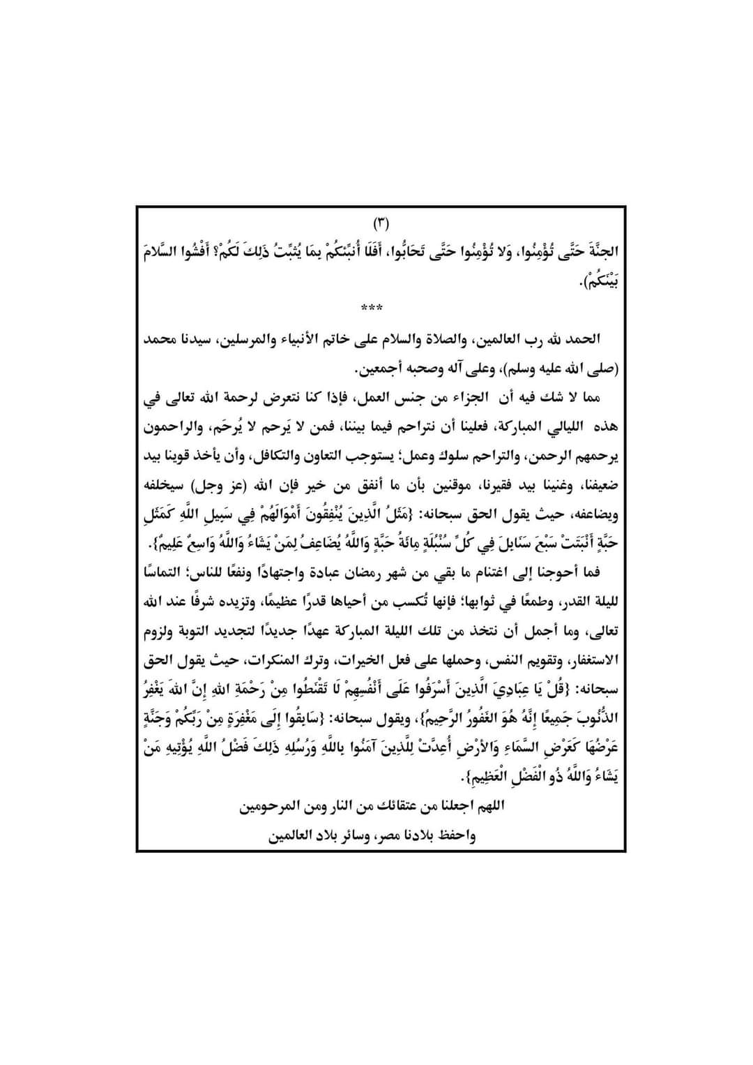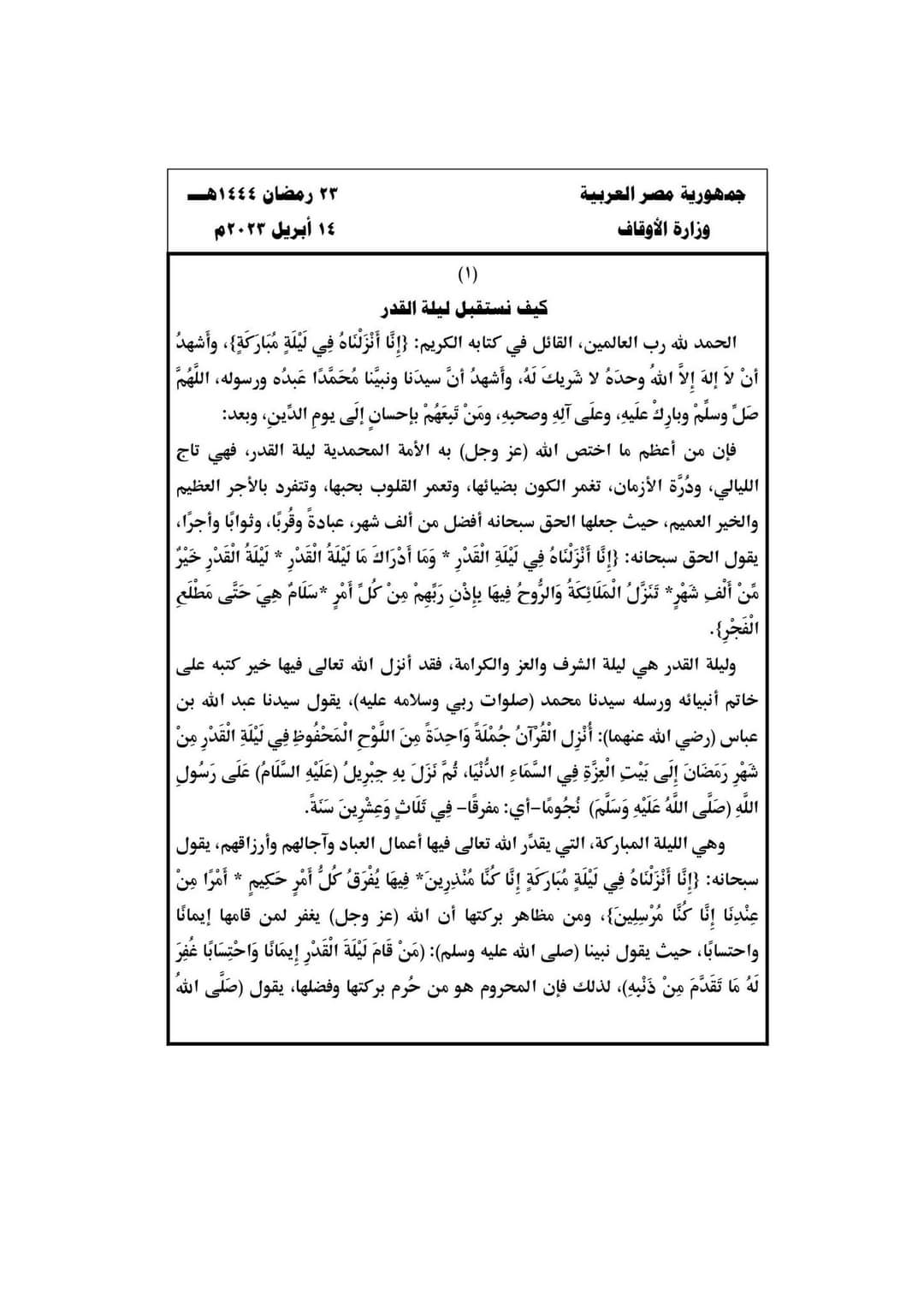 وأعلنت وزارة الأوقاف في بيان لها، أنها قررت أن يكون موضوع خطبة الجمعة القادمة 14 أبريل 2023 بعنوان «كيف نستقبل ليلة القدر؟».