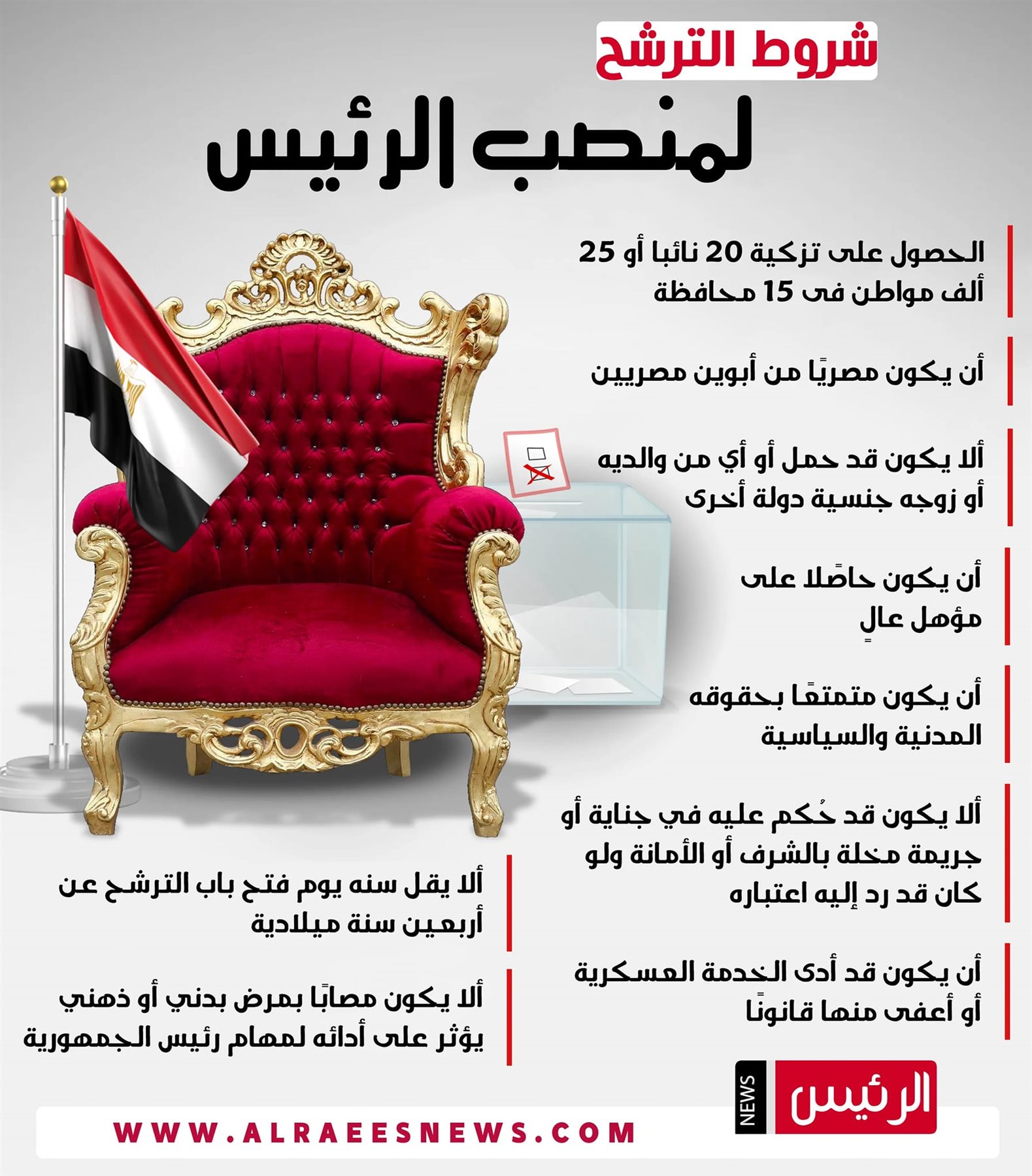 يذكر أنه يشترط لقبول الترشح لرئاسة الجمهورية أن يزكي المترشح عشرون عضوا على الأقل من أعضاء مجلس النواب، أو أن يؤيده ما لايقل عن 25 ألف مواطن ممن لهم حق الانتخاب فى خمس عشرة محافظة على الأقل، وبحد أدنى ألف مؤيد من كل محافظة منها، وفقا للمادة (142) من الدستور.