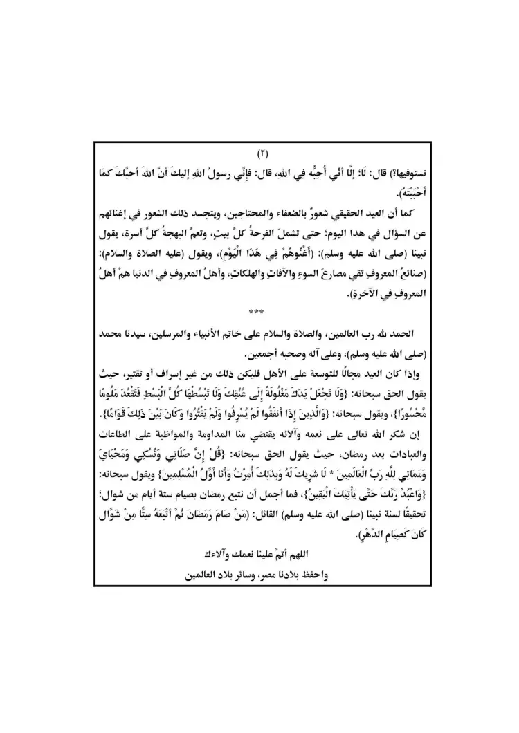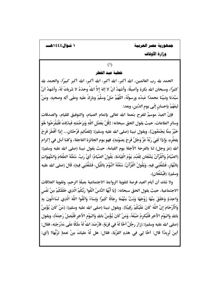 خطبة عيد الفطر 2023 من وزارة الأوقاف مكتوبة