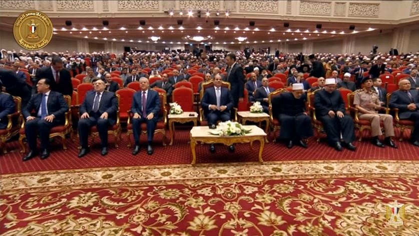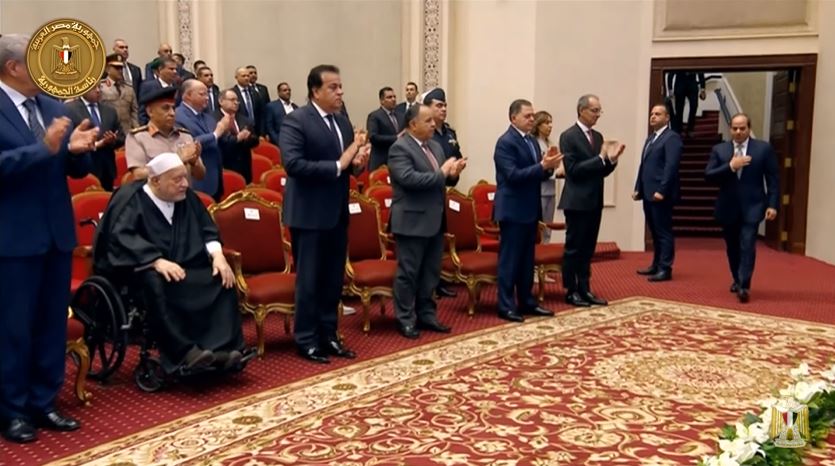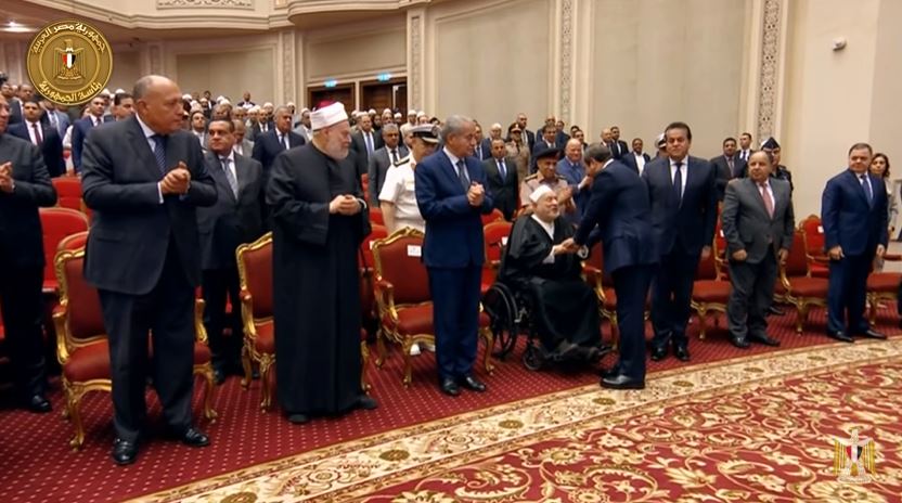 وكان في استقبال الرئيس السيسي فور وصوله فضيلة الإمام الأكبر الدكتور أحمد الطيب شيخ الأزهر الشريف، ووزير الأوقاف الدكتور محمد مختار جمعة.