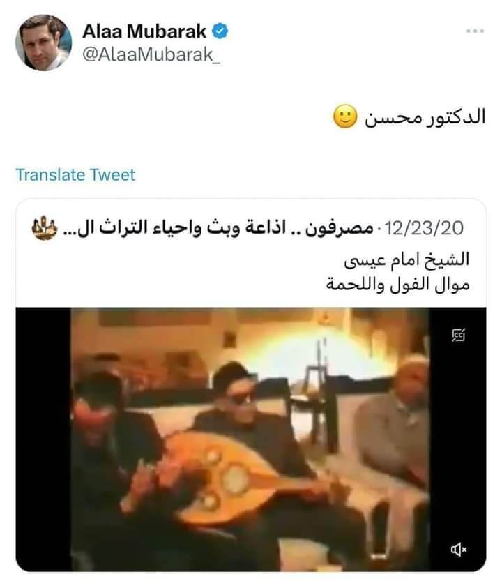 وقال له مغرد آخر: "طب دي حاجة كويسة وعظيمة أنه علاء مبارك بيسمع وينشر أغاني الشيخ إمام وأحمد فؤاد نجم.. بجد شابوه أستاذ علاء".