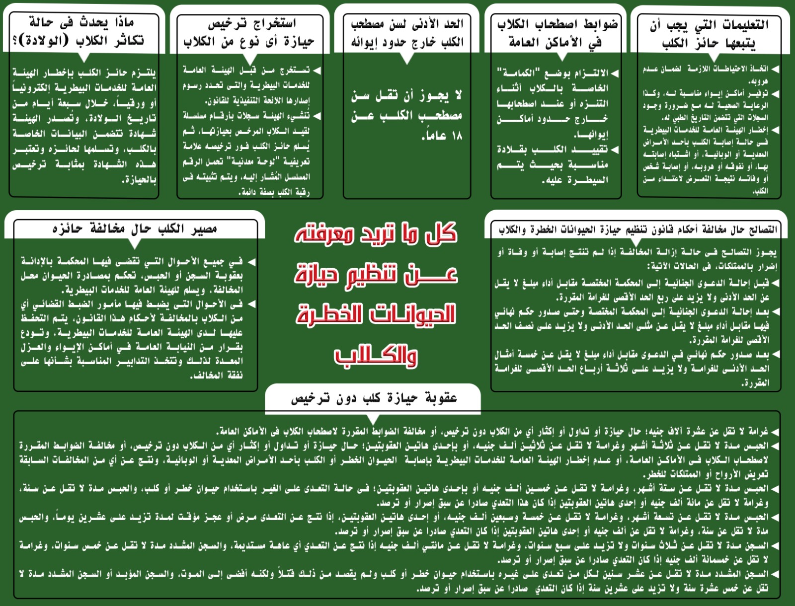 الحبس مدة لا تقل عن ثلاثة أشهر وغرامة لا تقل عن ثلاثين ألف جنيه، أو بإحدى هاتين العقوبتين؛ حال حيازة أو تداول أو إكثار أي من الكلاب دون ترخيص، أو مخالفة الضوابط المقررة لاصطحاب الكلاب فى الأماكن العامة، أو عدم إخطار الهيئة العامة للخدمات البيطرية بإصابة الحيوان الخطر أو الكلب بأحد الأمراض المعدية أو الوبائية، ونتج عن أي من المخالفات السابقة تعريض الأرواح أو الممتلكات للخطر.