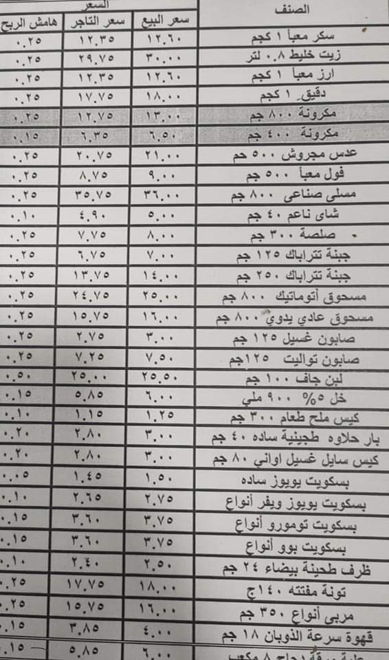 وجاءت أسعار السلع التموينية الجديدة التي سيبدأ تطبيقها غدا الإثنين 1 مايو 2023 كالآتي:
