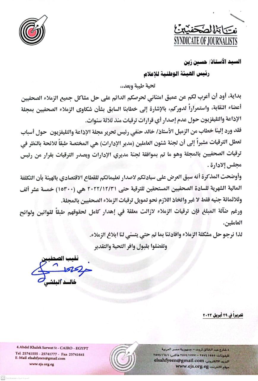 أرسل الكاتب الصحفي خالد البلشي، نقيب الصحفيين خطابين متتابعين إلى حسين زين، رئيس الهيئة الوطنية للإعلام؛ بصفته رئيسا لمجلس إدارة مجلة الإذاعة والتليفزيون، يطالبه بحل الأزمات المالية للصحفيين العاملين بالمجلة، ولديهم مستحقات متأخرة بين ماليات وترقيات متوقفة منذ عدة سنوات بمخالفة القانون.