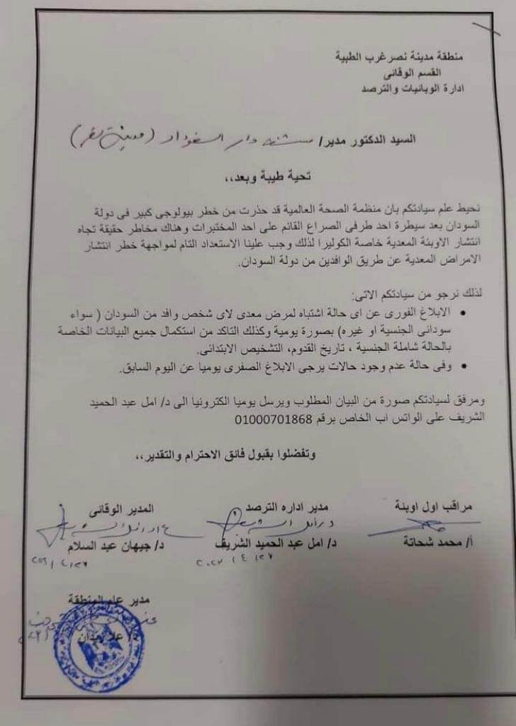 نحيط علم سيادتكم بأن منظمة الصحة العالمية قد حذرت من خطر بيولوجي كبير في دولة السودان نتيجة سيطرة أحد طرفي الصراع القائم على أحد المختبرات وهناك مخاطر حقيقية تجاه انتشار الأوبئة المعدية خاصة الكوليرا، لذلك وجب علينا الاستعداد التام لمواجهة خطر انتشار الأمراض المعدية عن طريق الوافدين من دولة السودان، لذلك نرجو منكم الآتي: