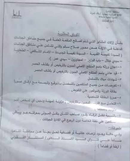 وجاء في نص الخطاب: "بشأن الإزالات التي تتم لصالح المنفعة العامة في جميع مناطق الجبانات الداخلة في الإزالة ضمت أعمال محور صلاح سالم والتي تشتمل على مناطق جبانات: (السيدة نفيسة القديمة والجديدة والإمام الشافعي والطحاوية وسيدي جلال وباب الوزير والمجاورين وسيدي عمر) يتم تقديم الأوراق التالية":