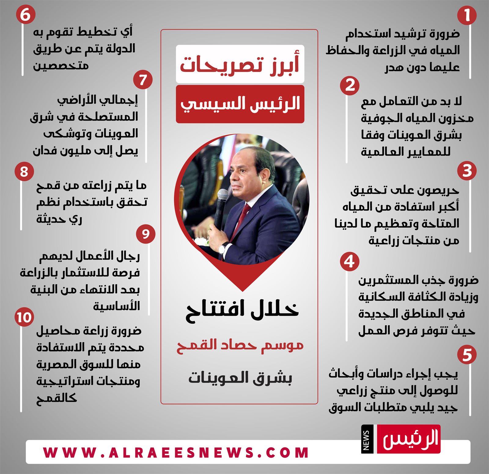 وقال الرئيس السيسي- في مداخلة خلال كلمة اللواء أركان حرب توفيق سامي رئيس مجلس إدارة الشركة الوطنية لاستصلاح واستزراع الأراضي خلال افتتاح موسم حصاد القمح وافتتاح مصنع البطاطس في شرق العوينات بالوادي الجديد اليوم الأحد: "إننا نحتاج إلى التأكد من أن مخزون المياه الجوفية في شرق العوينات يتم التعامل معه وفقا للمعايير العالمية واستخدام المياه بشكل رشيد دون هدر سواء للاستخدامات المخصصة للزراعة أو للمستثمرين"، مشددا على أهمية ترشيد المياه واستخدام نظم الري الحديثة في كافة الزراعات.