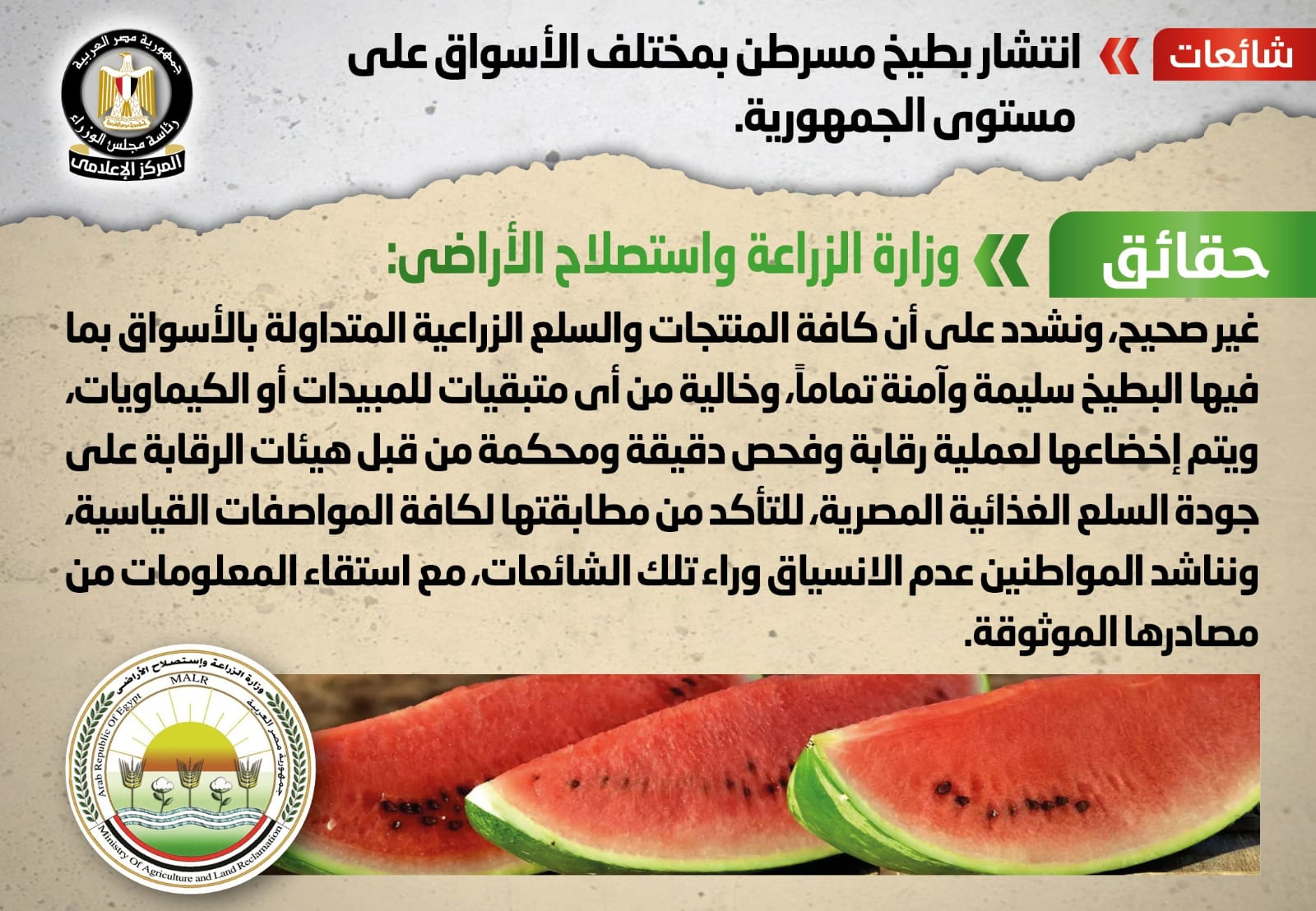 نفى المركز الإعلامي لمجلس الوزراء ما انتشر من أنباء بشأن انتشار بطيخ مسرطن بمختلف الأسواق على مستوى الجمهورية.