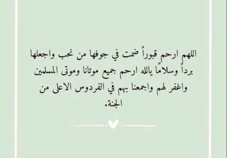 - اللهم في كل دقيقه تمر على أمواتنا وهم في قبورهم أسالك ؛ يارب أن تفتح لهم بابًا تهب منه نسائم الجنه، وتؤنس وحدتهم وتهون عليهم وحشة القبر اللهم برد تربة قبر كل عزيز رحل عنا اللهم نور مرقدهم وعطر مشهدهم وطيب مضجعهم وآنس وحشتهم واعتق رقابنا ورقابهم من النار.