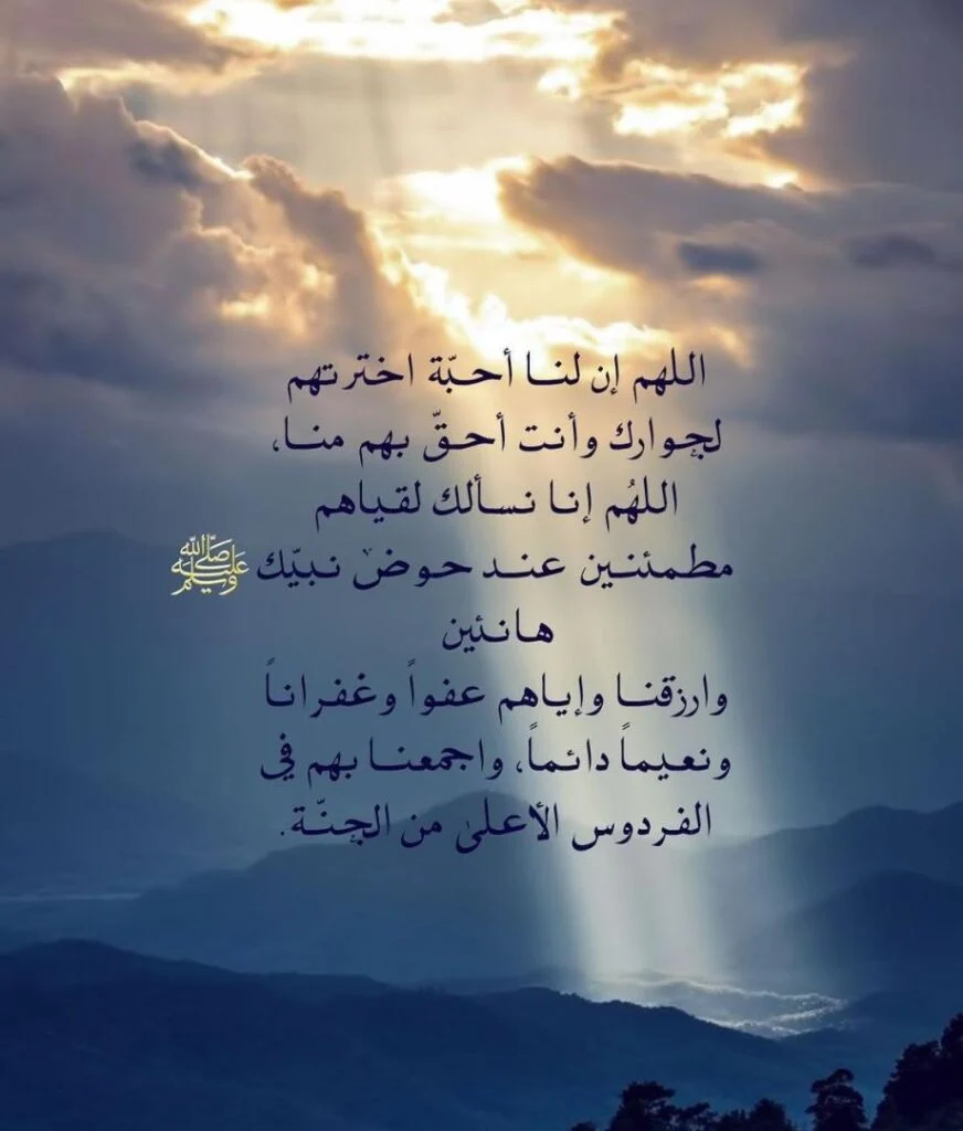 - اللهم إن عبدك بجوارك وأنت يا الله خير من يكون بجوار عبادك، فاغفر له وارزقه الرضا التام عنه واجعل روحه رضيّة ومستبشرة وهانئة، وامنحه مقعدًا من نعيمك الذي لا ينفذ يا أكرم الأكرمين.
