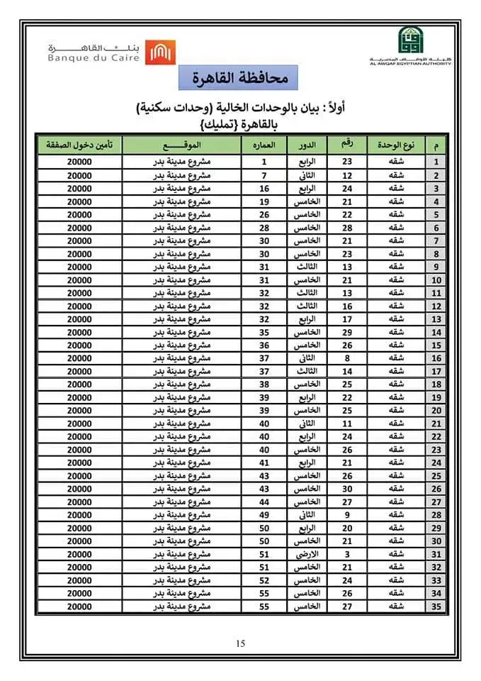 وأوضحت الأوقاف، أن عملية بيع وإيجار شقق سكنية وإدارية ومحلات تجارية وجراجات وأواضي بعمارات الهيئة في محافظات مصر، ستتم من خلال إقامة مزاد علني بالتعاون مع بنك القاهرة.