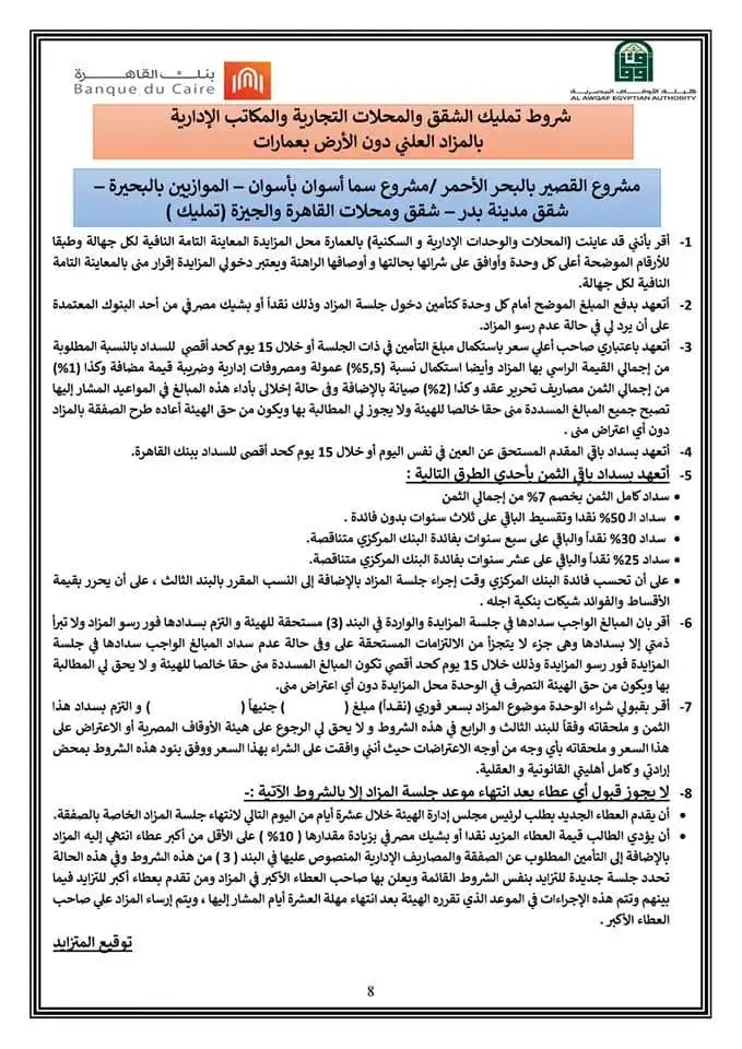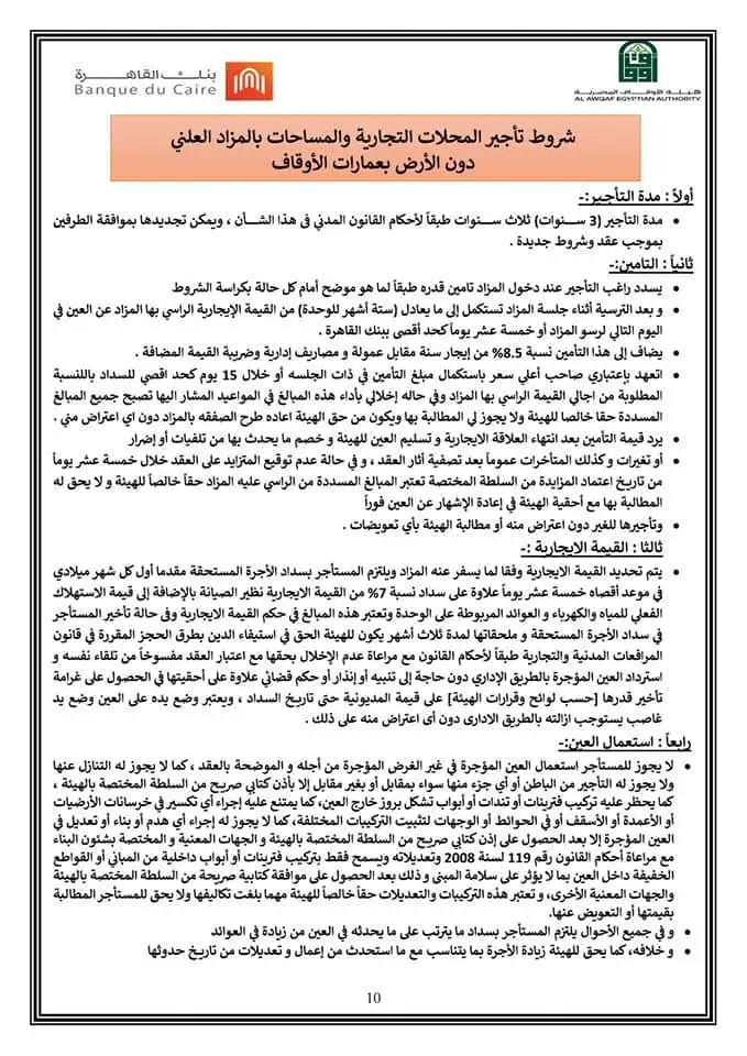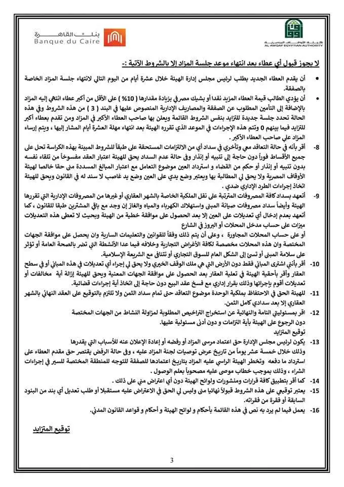 3- كافة التفاصيل والتأمين موضحة بكراسة الشروط تطلب كراسات الشروط من الموقع ومقر الهيئة ومناطقها بالمحافظات وجميع فروع بنك القاهرة.
