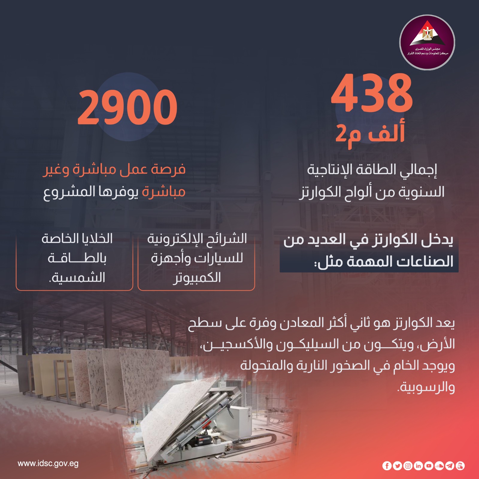 نشر مركز المعلومات ودعم اتخاذ القرار بمجلس الوزراء، على صفحته الرسمية بموقع التواصل الاجتماعي "فيس بوك"، إنفوجراف حول افتتاح الرئيس عبد الفتاح السيسي، اليوم الخميس، لأول مجمع مصانع لإنتاج الكوارتز في الشرق الأوسط وإفريقيا، بطاقة إنتاجية 438 ألف متر مربع من المعدن، تعظيمًا للاستفادة من حجم احتياطي مصر من خام الكوارتز، الذي يصل إلى نحو 3.5 ملايين طن بنسبة نقاوة تصل إلى 99%، وهو ما يجعل مصر تمتلك ميزة تنافسية كبيرة في تلك الصناعة.