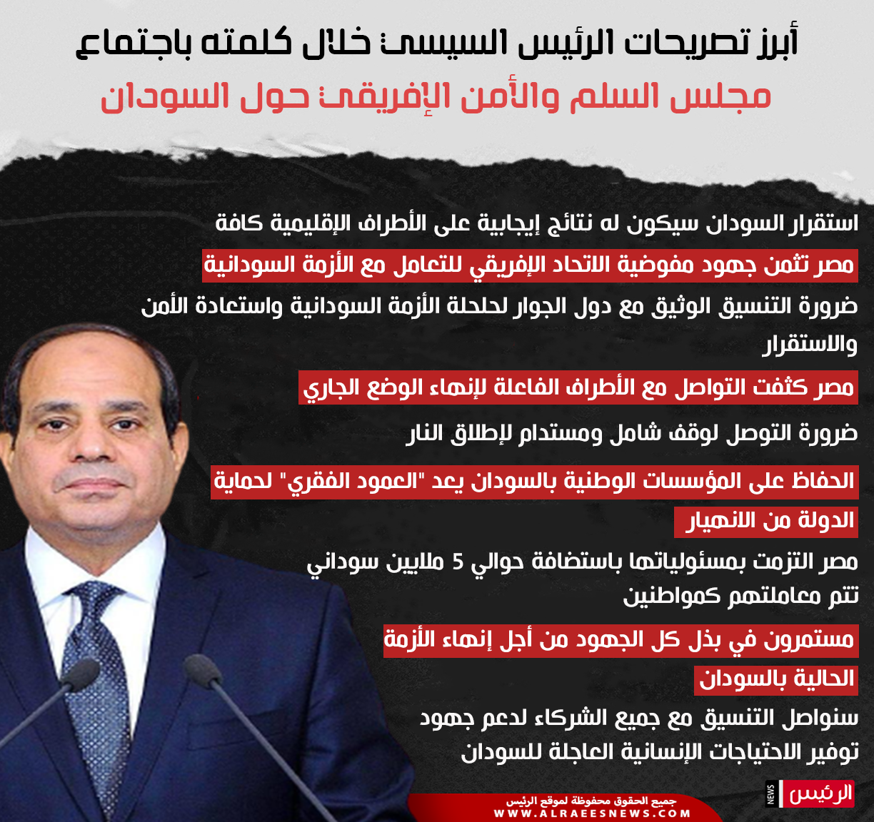 وفي السياق، نستعرض أبرز تصريحات الرئيس السيسي خلال كلمته في اجتماع مجلس السلم والأمن الإفريقي حول السودان: