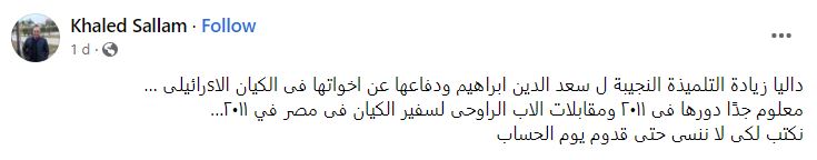 وقال خالد سلامة عبر "فيسبوك": "داليا زيادة التلميذة النجيبة لـ سعد الدين إبراهيم ودفاعها عن إخواتها في الكيان الصهيوني.. معلوم جدًا دورها فى ٢٠١١ ومقابلات الأب الروحى لسفير الكيان في مصر.. نكتب لكى لا ننسى حتى قدوم يوم الحساب".