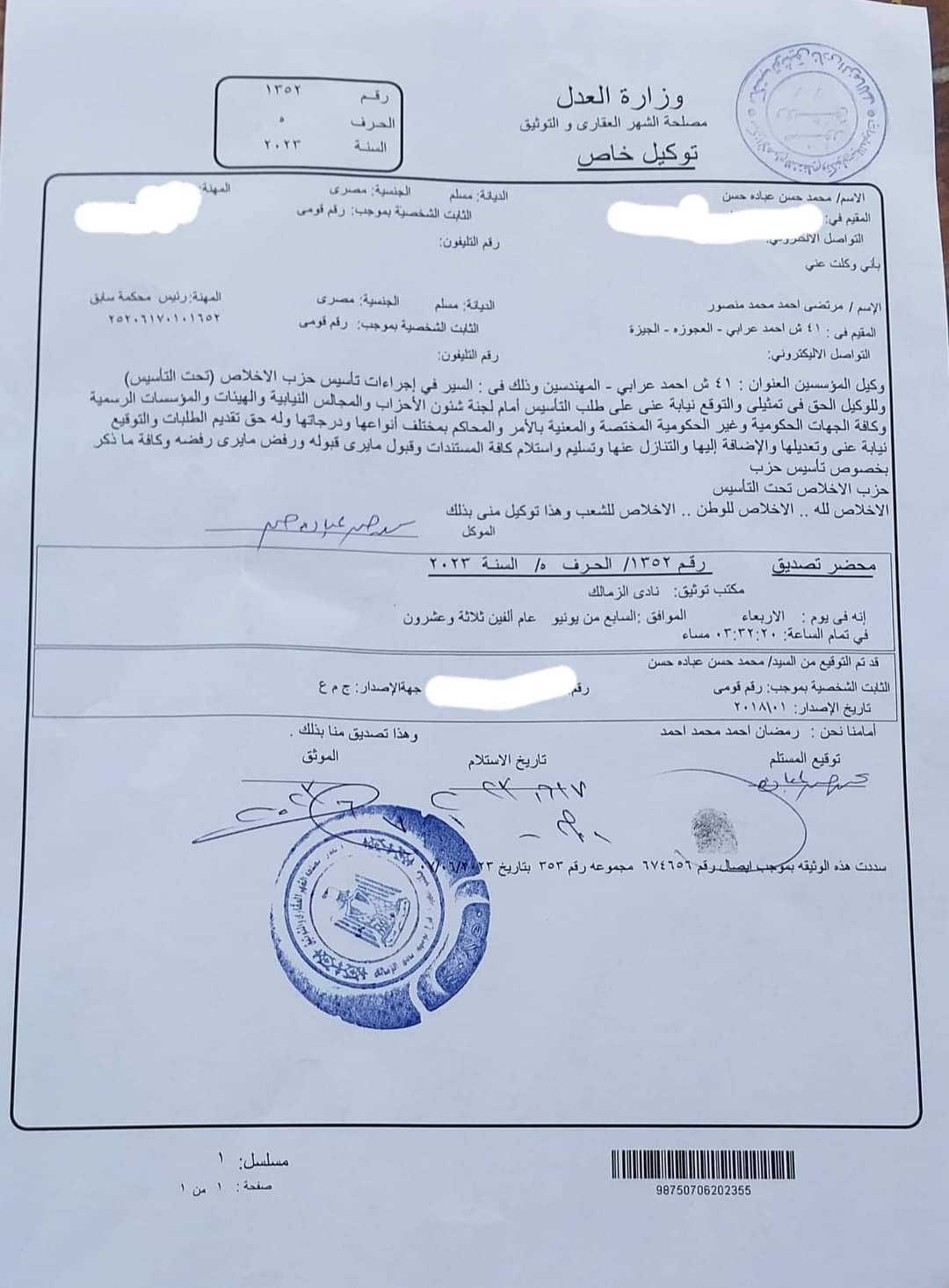 وقال نص التوكيل، إنه للوكيل الحق في تمثيلي والتوقيع نيابة عني على طلب التأسيس أمام لجنة شئون الأحزاب والمجالس النيابية والهيئات والمؤسسات الرسمية وكل الجهات الحكومية وغير الحكومية المختصة والمعنية بالأمر والمحاكم بمختلف أنواعها ودرجاتها، وله حق تقديم الطلبات والتوقيع نيابة عني وتعديلها والإضافة إليها والتنازل عنها وتسليم واستلام كافة المستندات وقبول ما يرى قبوله ورفض ما يرى رفضه، وكل ما ذكر بخصوص تأسيس حزب الإخلاص.