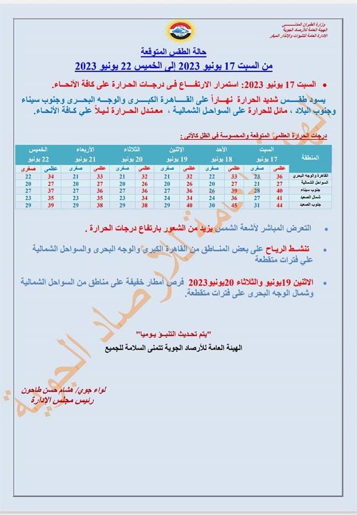 أعلنت الهيئة العامة للأرصاد الجوية، تفاصيل حالة الطقس ودرجات الحرارة بداية من غد السبت الموافق 17 يونيو، إلى الخميس 22 يونيو.
