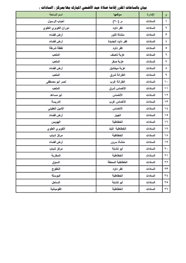أماكن صلاة عيد الأضحى 2023 في مركز السادات: 26 ساحة.
