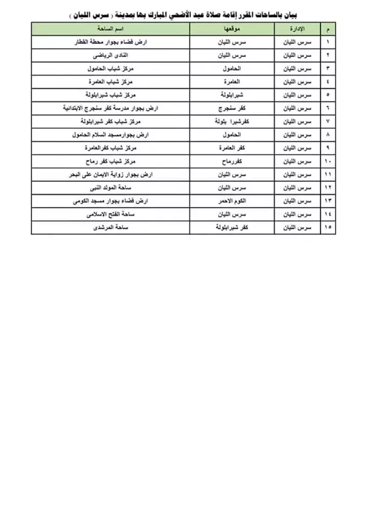 أماكن صلاة عيد الأضحى 2023 في مركز سرس الليان: 14 ساحة.