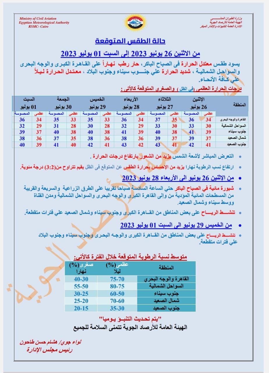 حذرت هيئة الأرصاد الجوية في بيانها من حالة الطقس اعتبارا من اليوم الإثنين وحتى السبت المقبل، مشيرة إلى ارتفاع معدلات الرطوبة والتي يزيد من الشعور بحرارة الطقس بقيم تتراوح بين 2 إلى 3 درجات مئوية، بالإضافة إلى التعرض لأشعة الشمس المباشرة.
