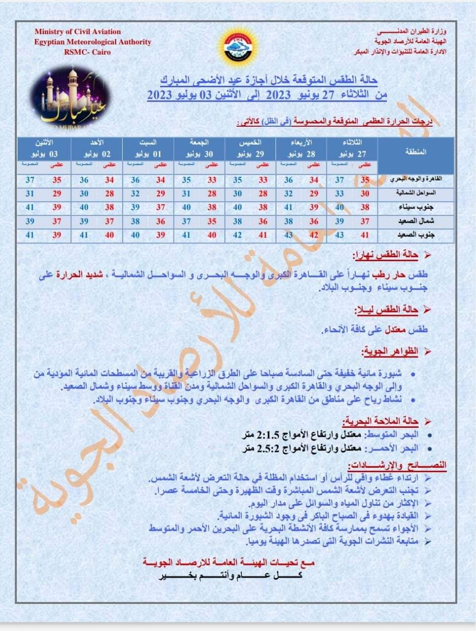 وطالبت الأرصاد بالإكثار من تناول السوائل الباردة والمياه، مع ارتداء الملابس القطنية والفضفاضة، وارتداء غطاء للرأس أثناء الخروج ساعة الذروة فى درجات الحرارة، والتواجد فى أماكن جيدة التهوية.