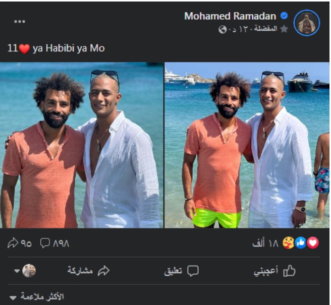 شارك الفنان محمد رمضان جمهوره بصورة التقطها مع نجم ليفربول محمد صلاح، لاعب المنتخب الوطني الأول الذي يقضي إجازته الأسبوعية في الساحل الشمالي وذلك عبر صفحاته الرسمية بمواقع التواصل (فيسبوك).