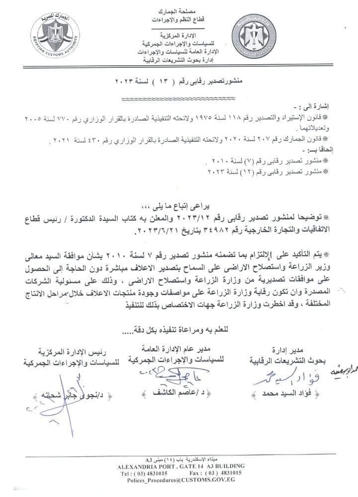 وقالت مصلحة الجمارك، في منشور رقابي رقم 13 لسنة 2023، إن عملية تصدير الأعلاف تتم مباشرة ولا تحتاج إلى الحصول على موافقات تصديرية من وزارة الزراعة واستصلاح الأراضي، وذلك مع التأكيد على منشور تصدير رقم 7 لسنة 2010 بشأن موافقة وزير الزراعة واستصلاح الأراضي على السماح بتصدير الأعلاف مباشرة دون الحاجة إلى الحصول على موافقات تصديرية من وزارة الزراعة واستصلاح الأراضي، وذلك على مسئولية الشركات المصدرة وأن تكون رقابة وزارة الزراعة على مواصفات وجودة منتجات الاعلاف خلال مراحل الإنتاج المختلفة، حيث اخطرت وزارة الزراعة جهات الاختصاص بذلك للتنفيذ.