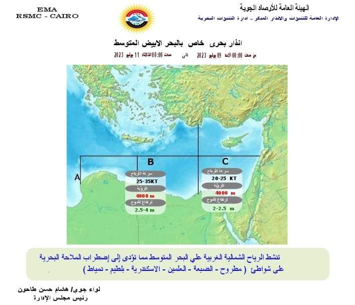 وقالت الأرصاد: من المتوقع أن تنشط الرياح الشمالية الغربية على شواطئ مسطح البحر المتوسط ( مطروح -الضبعة -العلمين - الإسكندرية -بلطيم - دمياط)، مما يعمل على اضطراب فى حركة الملاحة البحرية، وارتفاع الموج من ٢ إلى ٣ أمتار.