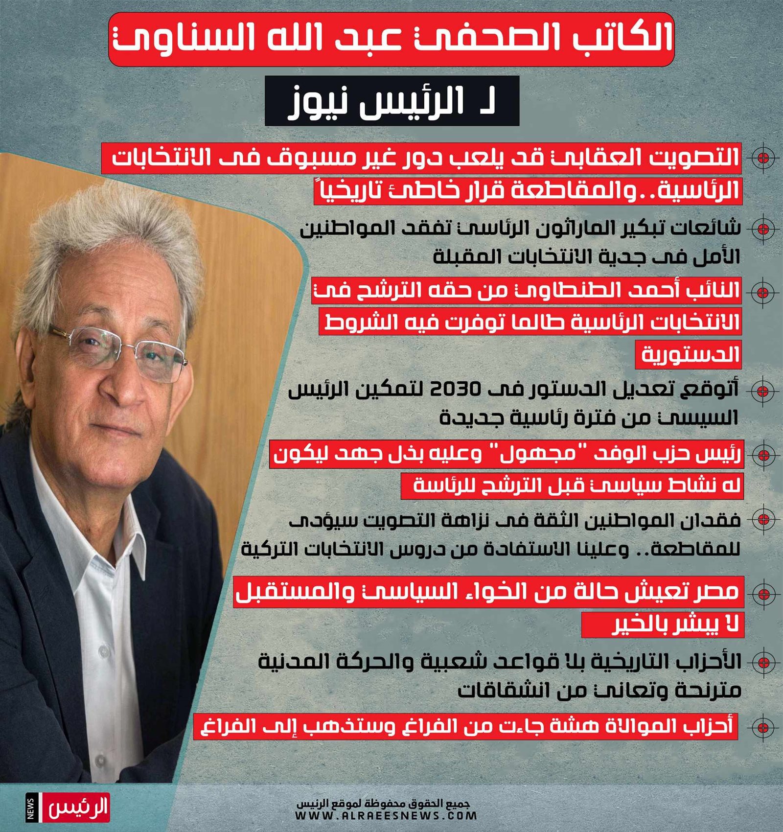 وقال السناوي في حواره لـ"الرئيس نيوز"، إن إعادة إنتاج مجالس نيابية بنظام القائمة المغلقة أمر لم يعد مقبولا، معقبا: “النخبة تريد مجلسا نيابيا له احترامه”.
