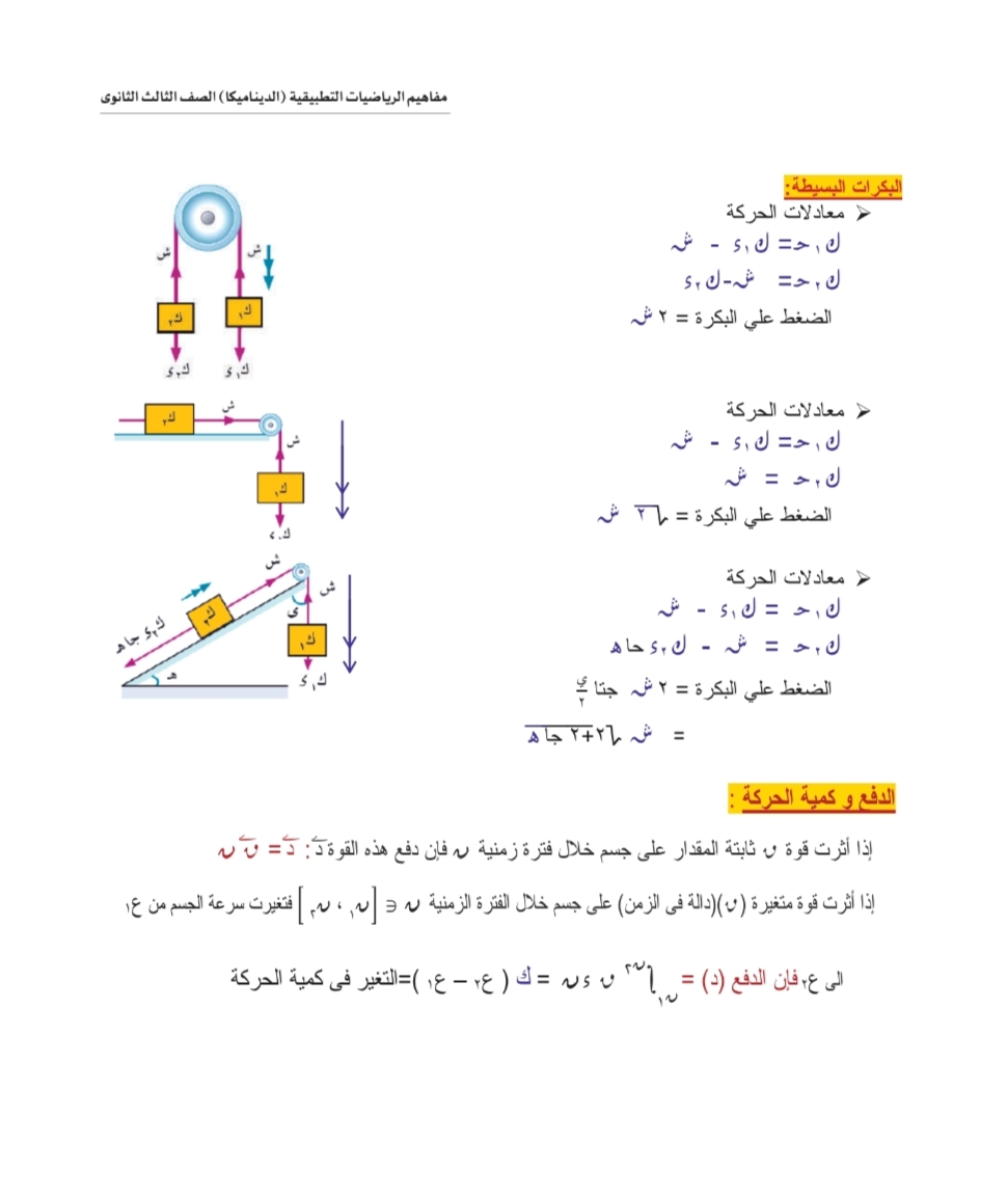 وينتقل الكتيب بعد ذلك إلى قوانين حركة جسم كتلته ك على مستوى مائل أول أملس يميل على الأفقي بزاوية قياسها هـ، والقوانين الخاصة بالبكرات البسيطة والدفع وكمية الحركة.