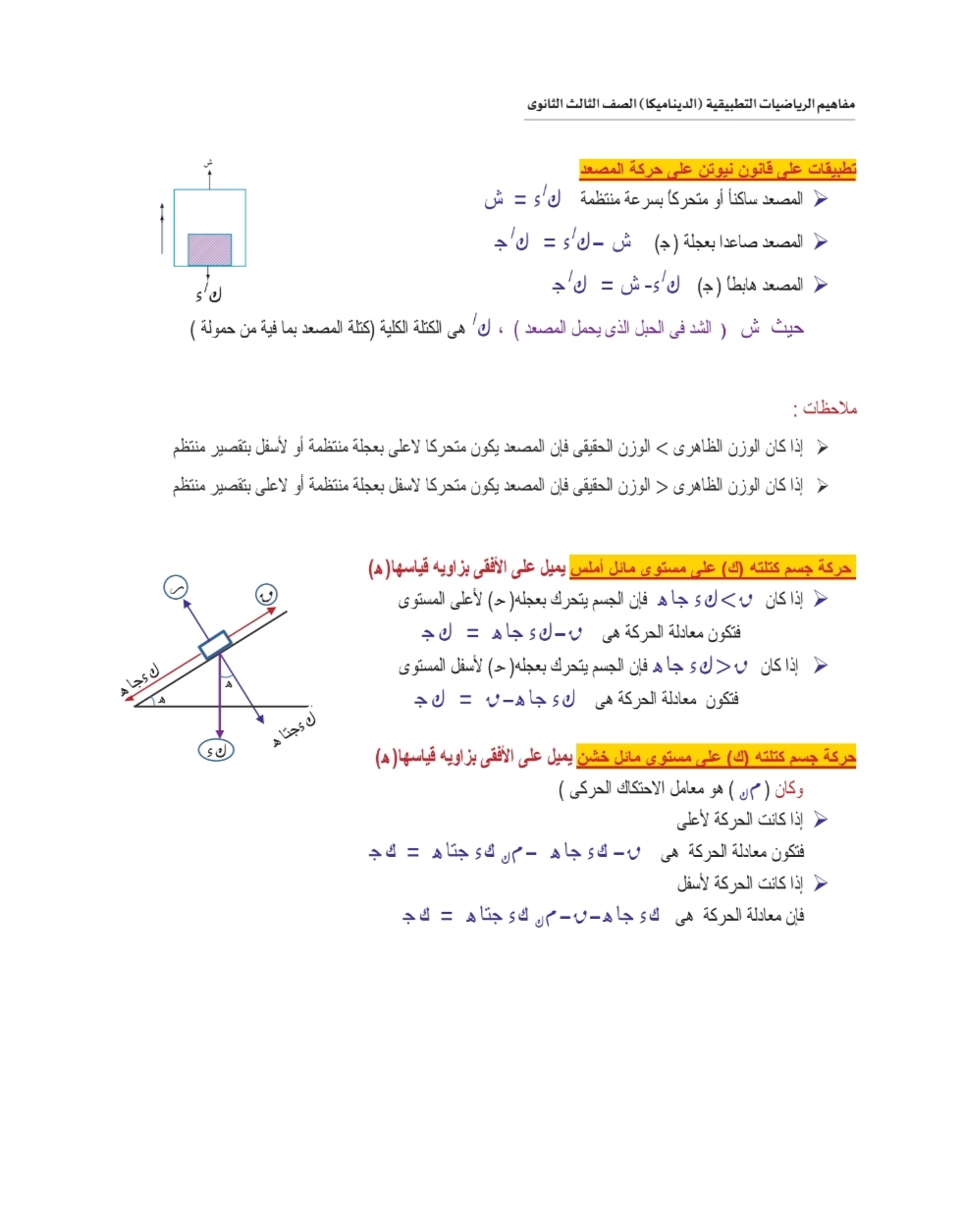 وبعد ذلك تستعرض ورقة المفاهيم قوانين نيوتن للحركة، مع الوحدات المستخدمة مع معادلة الحركة، وطريقة جل التطبيقات على قانون نيوتن على حركة جسم موضوع داخل مصعد، أو جسم معلق في ميزان زنبركي مثبت في سقف المصعد.