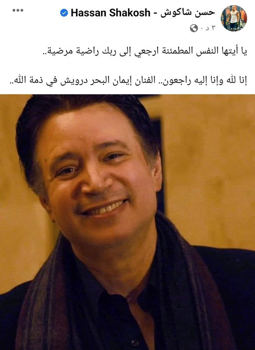 وكان مطرب المهرجانات الشعبية حسن شاكوش أعلن وفاة الفنان الكبير، فكتب عبر حسابه الرسمي بموقع التواصل الاجتماعي “فسبوك”: "يا أيتها النفس المطمئنة ارجعي إلى ربك راضية مرضية.. إنا لله وإنا إليه راجعون.. الفنان إيمان البحر درويش في ذمة الله".