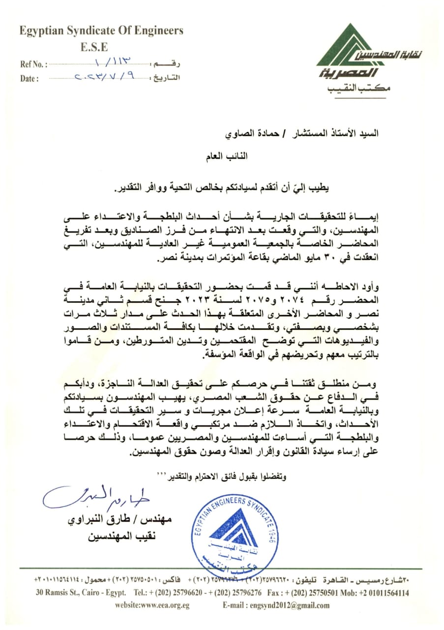 وفي خطابه للنائب العام أوضح النبراوي قائلًا:" إيماءً للتحقيقات الجارية بشأن أحداث البلطجة والاعتداء على المهندسين التي وقعت بعد الانتهاء من فرز الصناديق وبعد تفريغ المحاضر الخاصة بالجمعية العمومية غير العادية للمهندسين، التي انعقدت في ٣٠ مايو الماضي بقاعة المؤتمرات بمدينة نصر.